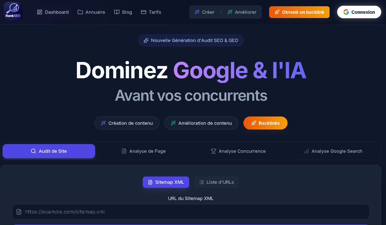 RankSEO se positionne comme un outil SEO tout-en-un,comparable à des solutions comme Semrush, SEO Hero, Majestic SEO, Rank Tracker ou MyPoseo, mais avec une approche orientée audit de référencement, analyse du positionnement SEO, pilotage et passage à l’action pour améliorer votre visibilité sur google.